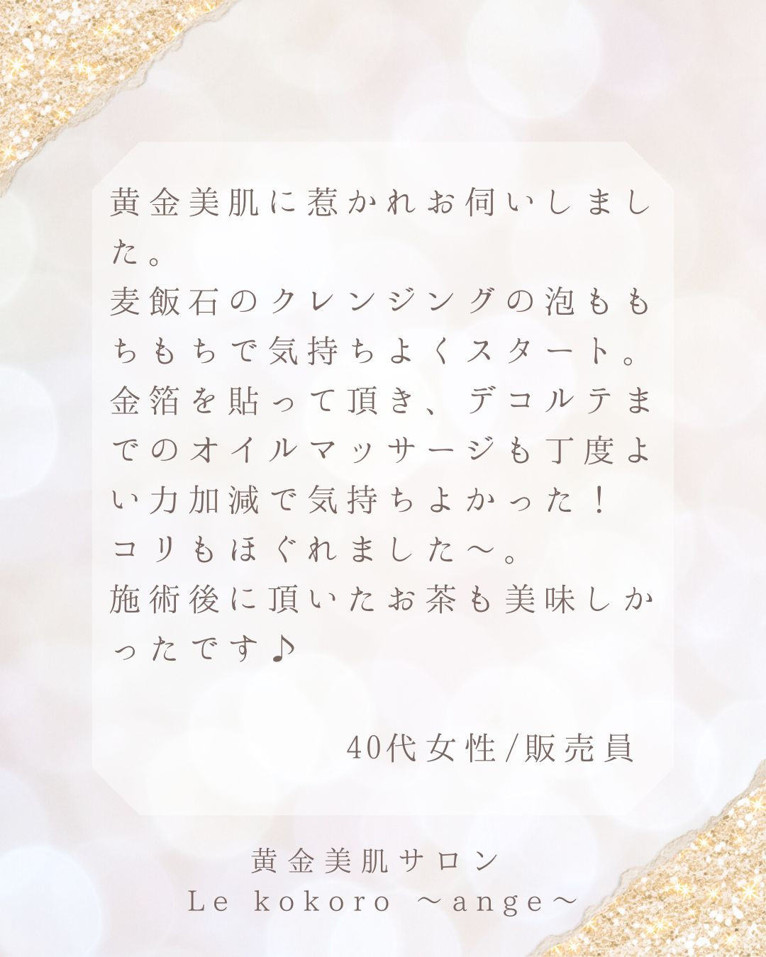 『黄金美肌に惹かれお伺いしました。麦飯石のクレンジングの泡ももちもちで気持ちよくスタート。金箔を貼って頂き、デコルテまでのオイルマッサージも丁度よい力加減で気持ちよかった!コリもほぐれました〜。施術後に頂いたお茶も美味しかったです♪ 40代女性/販売員』同じ歳でバリバリのキャリアウーマンなお客様。いつも刺激を沢山頂いております。ご来店いただき ありがとうございました😌