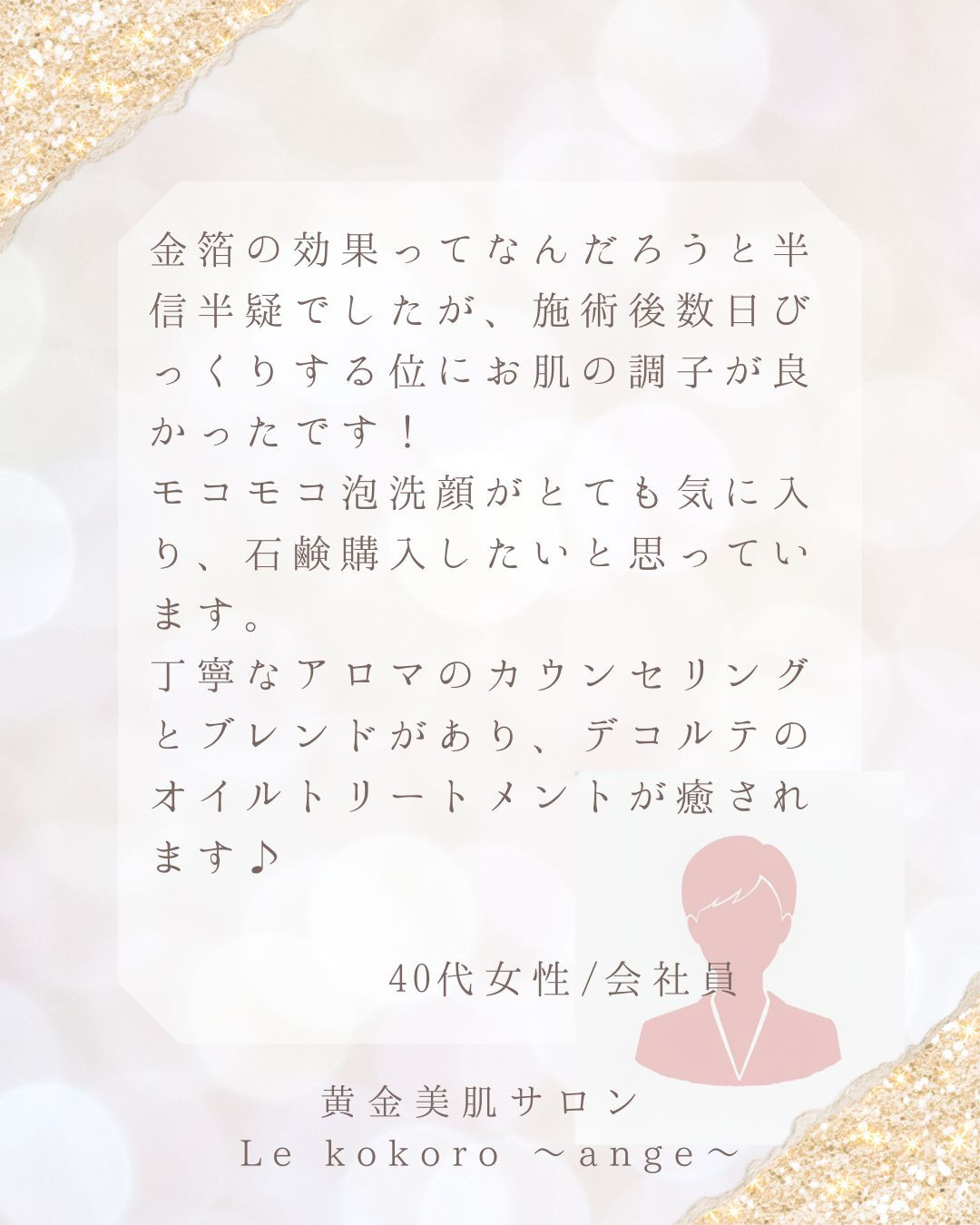 「金箔の効果ってなんだろうと半信半疑でしたが、施術後数日びっくりする位にお肌の調子が良かったです!